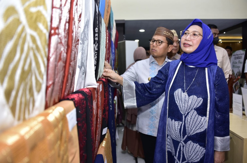 Ketua Dekranasda Provinsi Gorontalo bersama Penjabat Gubernur melihat kain karawo yang ada di Galeri UMKM Bank Indonesia. Selain berbagai macam takjil yang dijual dalam kegiatan bazar Ramadan, produk kerajinan tangan, seperti karawo, kerajinan eceng gondok, hingga aksesoris juga ikut meriahkan bazar Ramadan. (Foto: Fikri-Kominfotik)