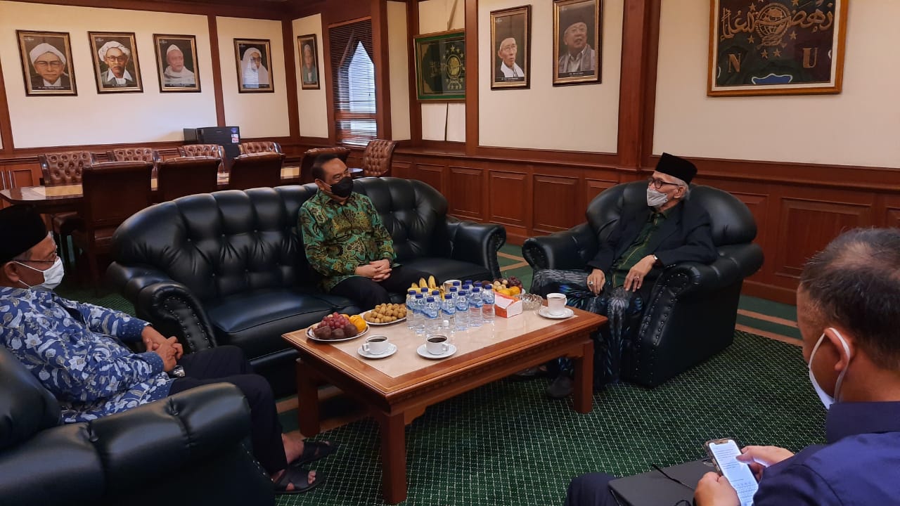 Suluhmerdeka.com – Wakil Ketua Umum Dewan Masjid Indonesia Komjen (Purn) Dr H Syafruddin MSi bertemu dengan Ketua Umum Majelis Ulama Indonesia, KH Miftachul Akhyar, Minggu, (31/1/2021) di Kantor Pusat Nahlatul Ulama, di Jakarta. Pertemuan silaturrahim membahas perkembangan Islam di tanah air dan dunia.