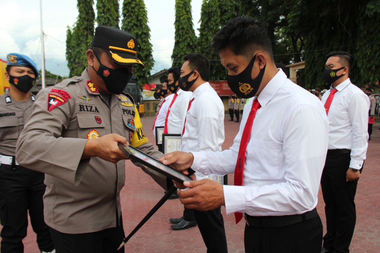 Kapolres Palu AKBP Riza Faisal menyerahkan penghargaan kepada salah satu anggotanya, Kamis, 6 Mei 2021. (Foto : Humas Polres Palu)