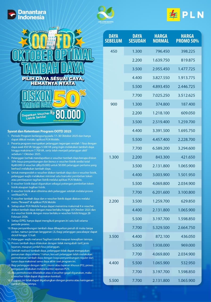 Diskon 50%, peluang emas tambah daya dengan Harga Hemat Promo OOTD ditujukan untuk pelanggan tegangan rendah satu fasa dengan daya awal antara 450 VA hingga 5.500 VA, yang ingin menambah daya hingga maksimal 7.700 VA. Pelanggan yang memenuhi syarat hanya perlu membayar setengah dari biaya normal, dengan syarat telah terdaftar sebagai pelanggan PLN sebelum 1 Oktober 2025.