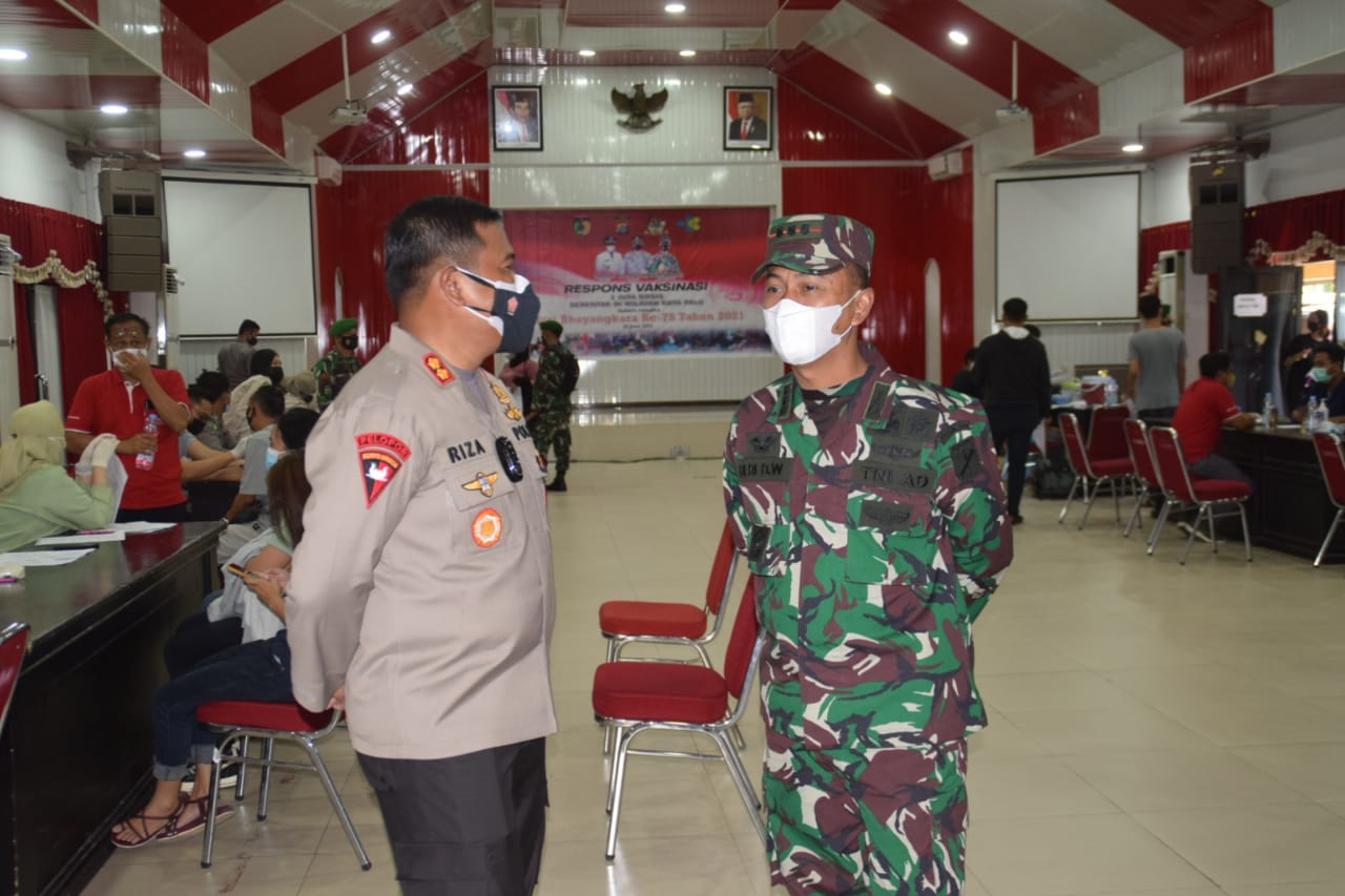 Suluhmerdeka.com – Kapolres Palu AKBP Riza Faisal bersama Dandim 1306 Donggala Kolonel Inf.Heri Bambang Wahyudi ,S.IP mengecek pelaksanaan vaksinasi Covid-19 secara massal yang dilaksanakan di Gedung Torabelo Polres Palu, Jalan Samratulangi No.78 Palu , Sabtu 26 Juni 2021 Pukul 08.30 Wita