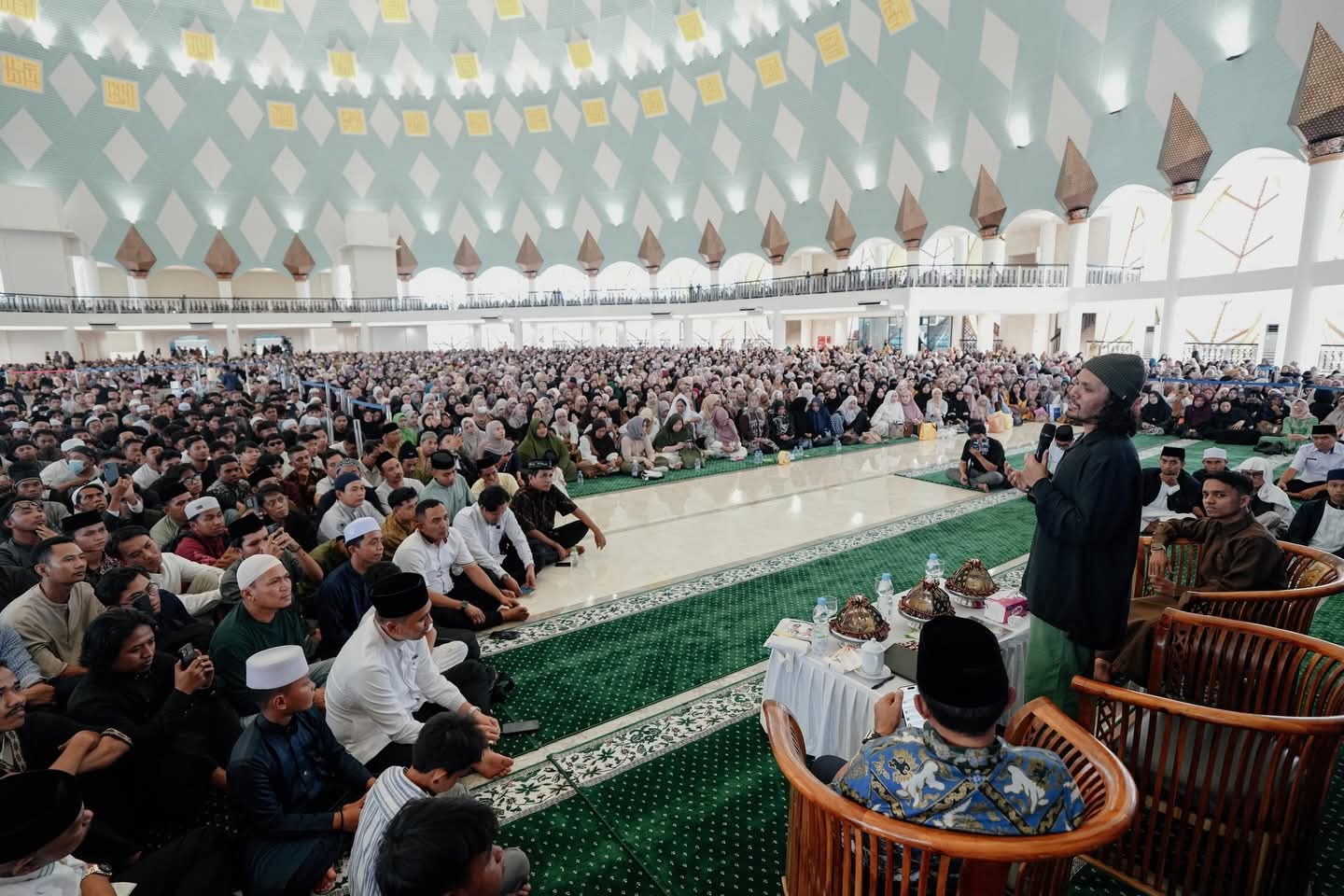 Di tengah keheningan yang menyentuh, suara Hanan Attaki menggema lembut namun menggetarkan. Dengan gaya khasnya yang menyejukkan, ia mengajak jamaah untuk menata hati dan meluruskan niat.